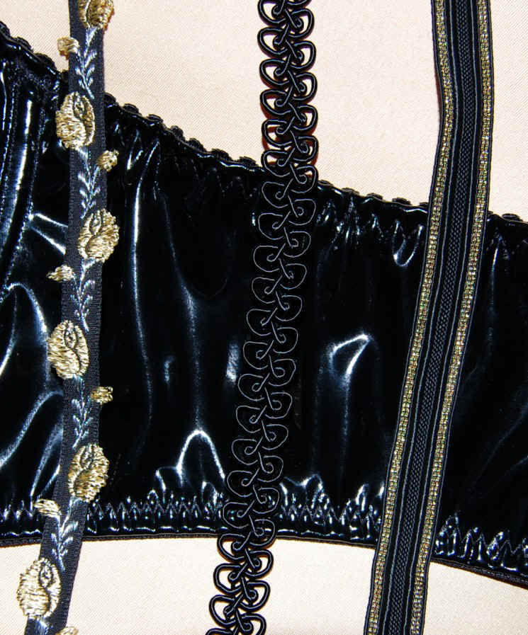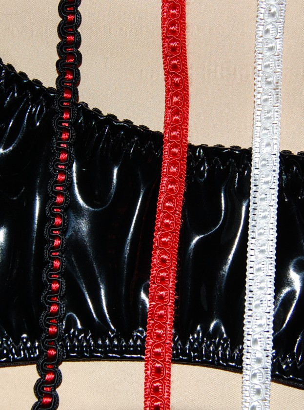 außerdem noch: Satinband schwarz, rosa oder weiss; Samtband schwarz Lackstoff- 8 % elastisch, in schwarz, weiss oder rot Lackstoff- 5 % elastisch, in pink