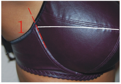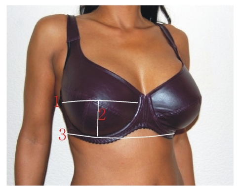 Maß 1: "Ein-Brust-Maß" waagrecht über den höchsten Punkt der Brust gemessen, ohne Bügelband ohne Bügelband messen (ab der gestrichelten Linie) Maß 3: Unterbrustumfang (UBU) waagrecht, möglichst genau und eng gemessen. |