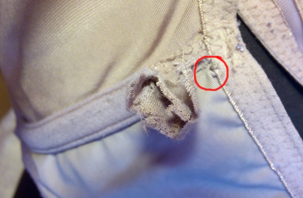 Arbeitsbeispiele: Oftmals bohrt sich der Bügel unter den Achsel sogar durch die Außenseite des Stoffes. Gerade bei sehr namhaften Dessousherstellern tritt dieses Problem oft auf. Bedauerlicherweise verwenden diese Hersteller Bügelbänder welche nicht als "Schlauch" geschlossen sind sondern nur gefaltet. Somit ist die Unterseite des Bügelbandes offen ! Durch zu starken Druck des Bügelendes kann es dann dazu kommen, daß sich der Bügel durch die offene Unterseite drückt und auch den äußeren Stoff durchbohrt (siehe Kreis). Das Bügelband muss an dieser Stelle wieder repariert und eine BBEV (Bügelbandendverstärkung) untergearbeitet werden. Ein reiner Bügelaustausch ohne diese Maßnahme wäre sinnlos, der Bügel käme sofort wieder durch.