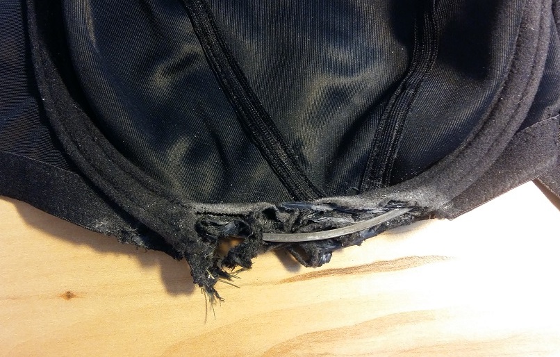 Arbeitsbeispiele: vorher: durch Waschmaschineneinzug zerfetzer Unterbrust-Gummi, Stoff, Bügelband